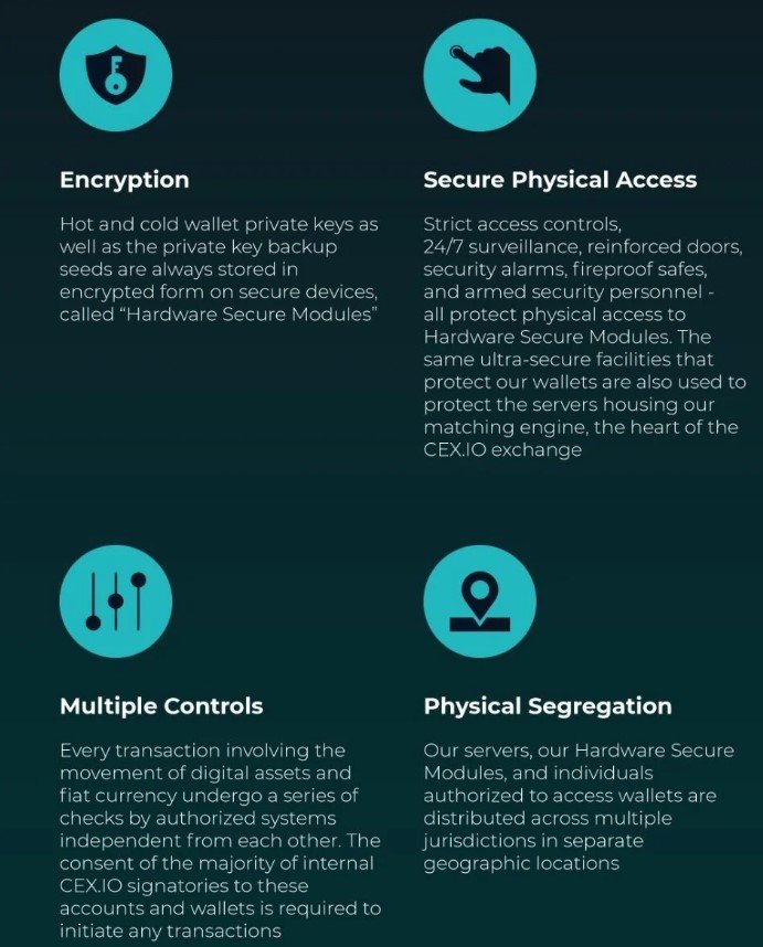CEX.IO guarda la gran mayoría de sus fondos en billeteras bloqueadas en bóvedas protegidas por guardias de seguridad armados y videovigilancia.