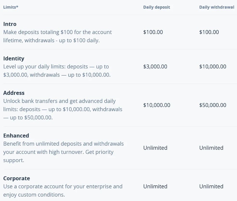 - Verificado: Las cuentas verificadas pueden comprar hasta $10,000 en bitcoins por día o hasta $100,000 por mes, utilizando tarjeta de crédito y transferencia bancaria. Para alcanzar este nivel, se requiere escanear un pasaporte, licencia de conducir o documento de identidad, y enviar una foto sosteniendo el documento, una foto de la tarjeta de crédito y un comprobante de residencia. Los límites de depósito aumentan a $3,000 diarios y $30,000 mensuales con tarjeta de crédito o débito.